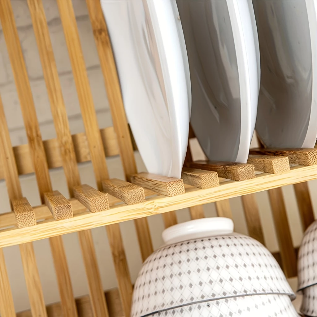 O bambu é um material renovável, antibacteriano e resistente à umidade, ideal para o ambiente da pia. Seu acabamento liso e estrutura firme garantem durabilidade mesmo com o uso diário, além de secar mais rapidamente do que escorredores plásticos ou metálicos, evitando acúmulo de água.