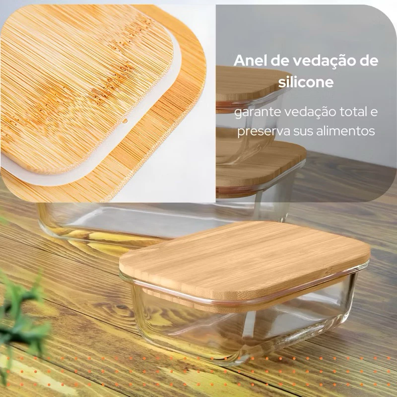 Os potes são feitos em vidro borossilicato de alta resistência térmica, duráveis e livres de BPA. As tampas de bambu com vedação em silicone mantêm os alimentos frescos por mais tempo e evitam vazamentos. São ideais para armazenar com segurança e ainda deixar sua geladeira ou bancada organizada e bonita.